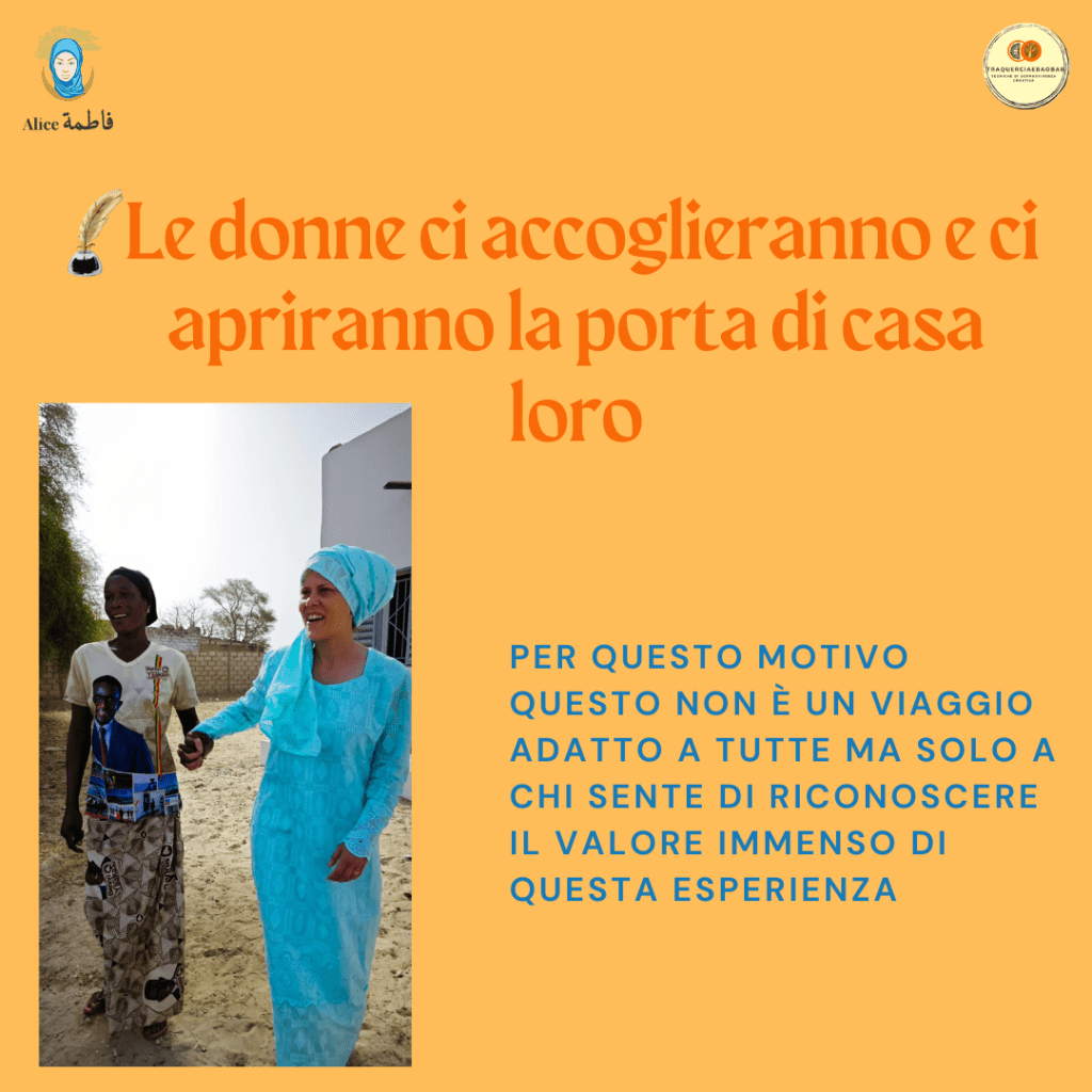Le donne del posto ci accoglieranno e apriranno la porta della loro casa. E in effetti quella è proprio casa loro.Per questo motivo è fondamentale partire con la voglia di mettersi in ascolto, rispettare la casa altrui e provare a mettere da parte ciò che pensiamo di sapere sull’Africa. Forse dopo dieci anni posso dire che in me scorre anche sangue senegalese; dopo il primo viaggio pensavo di aver capito tutto e invece non ero che all’inizio del percorso di conoscenza.