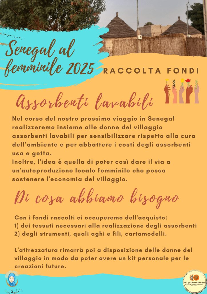 Durante il nostro soggiorno lì, una delle attività a cui ci dedicheremo sarà la produzione di assorbenti lavabili da lasciare alle donne del villaggio, sia per sensibilizzare rispetto alla cura dell’ambiente, sia per abbattere i costi dell’acquisto degli assorbenti usa e getta. Per poterli realizzare acquisteremo tessuti, aghi, fili, cartamodelli. Il nostro obiettivo è quello di acquistare il più possibile sul posto in modo da rendere autonome le donne quando vorranno produrne altri.