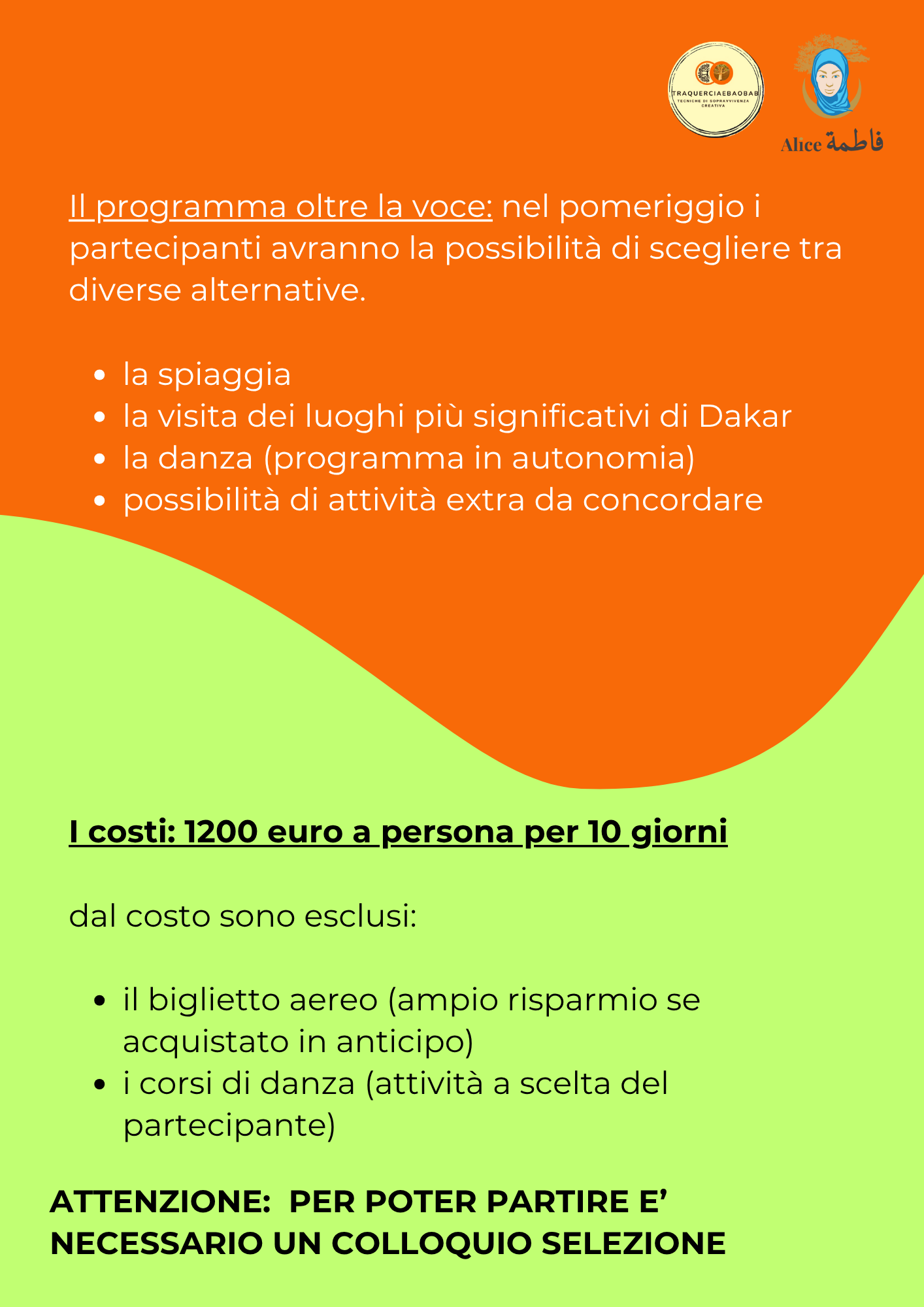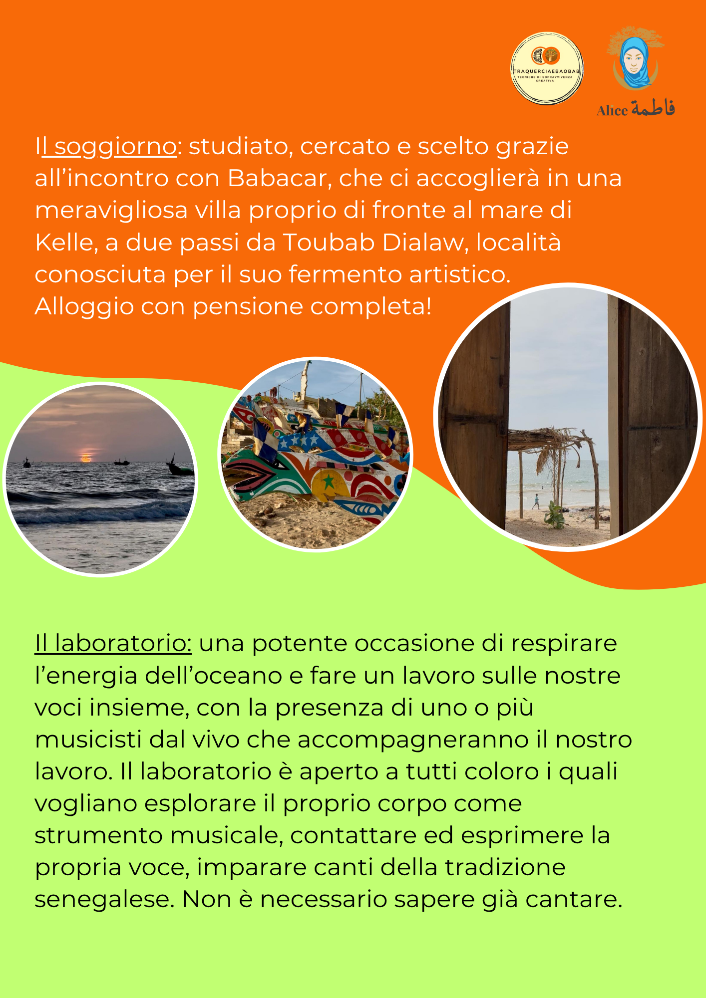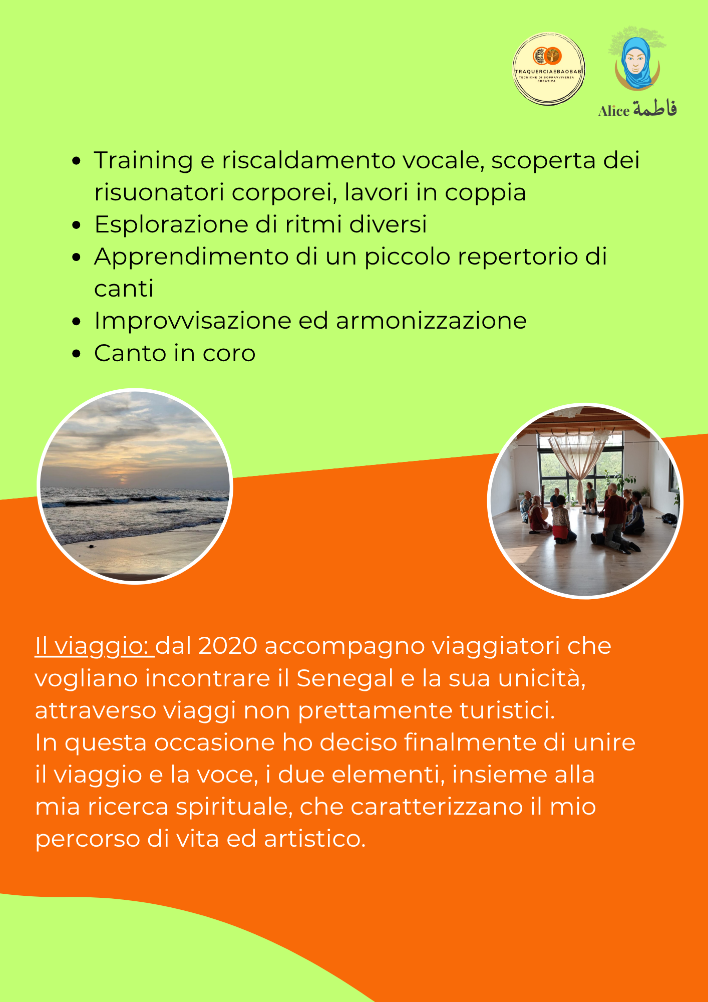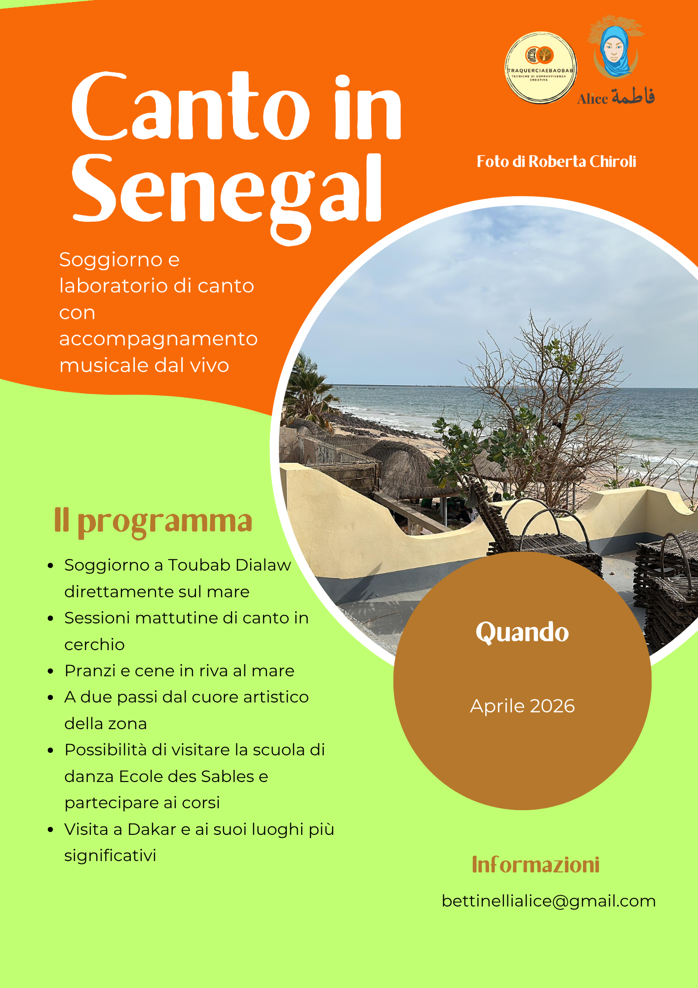 - Per il mese di aprile ho riservato un programma per me davvero bellissimo, un laboratorio di canto, con accompagnamento dal vivo, in Senegal! Vi condivido qui il volantino ma avremo modo di parlarne meglio nelle prossime settimane. Prima vi prenotate e meno costa il biglietto perciò vi consiglio di farci un pensiero…ora!